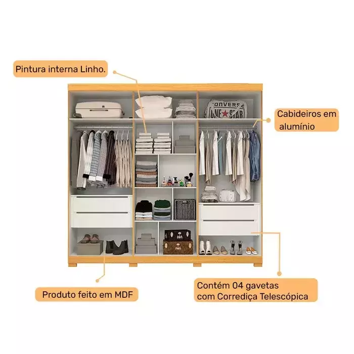 Características 💖Estrutura em MDF 12mmPintura interna linho6 Portas4 GavetasCorrediças telescópicasCabideiro em alumínioPés inclusosDimensões 📐Altura: 2,30 mLargura: 2,44 mProfundidade: 0,47 cm